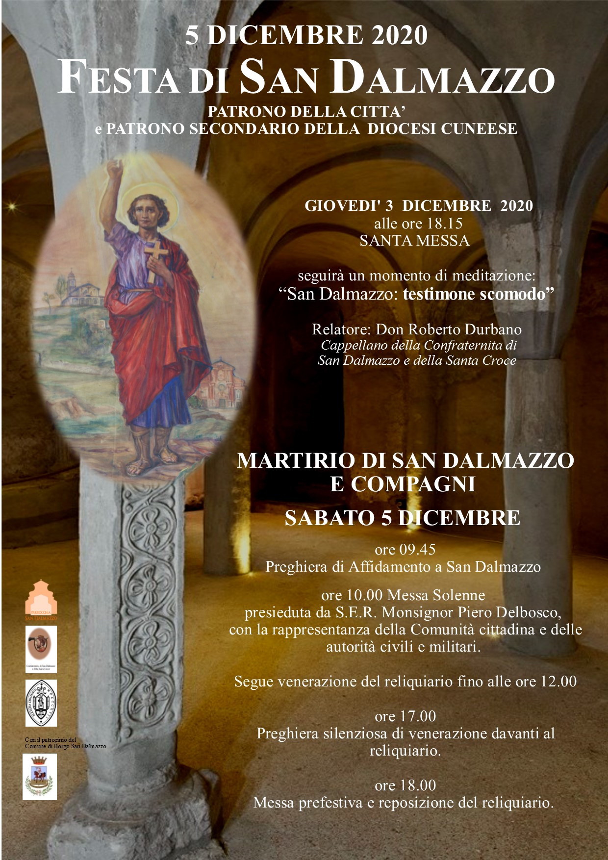 - nella giornata di giovedì 3 dicembre alle 18.15 la Santa Messa e a seguire una breve meditazione con tema: “San Dalmazzo: testimone scomodo”.