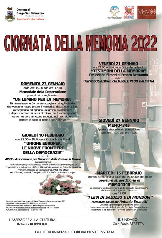 L’Amministrazione Comunale accoglierà i singoli cittadini che vorranno recarsi presso il Memoriale della Deportazione consegnando ad ognuno un lumino da accendere e deporre accanto ai nomi di coloro che furono deportati, come ricordo e rinnovato impegno nel promuovere pensieri e azioni di pace e non violenza
