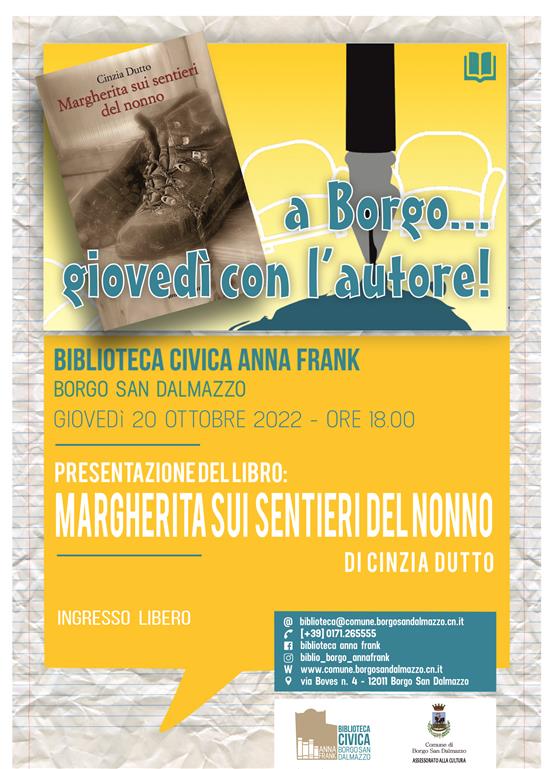 Il primo appuntamento sarà giovedì 20 ottobre alle ore 18.00 con l’autrice locale Cinzia DUTTO che presenterà la sua ultima pubblicazione '’MARGHERITA SUI SENTIERI DEL NONNO’’, un libro pieno di sentimenti che ci porterà a spasso tra passato, presente e futuro. Cinzia Dutto si definisce una 'cacciatrice di storie’: racconta vicende di vita legate alla montagna e alla Resistenza, utilizzando come fonte una serie di lettere e documenti appartenenti a suo nonno partigiano.