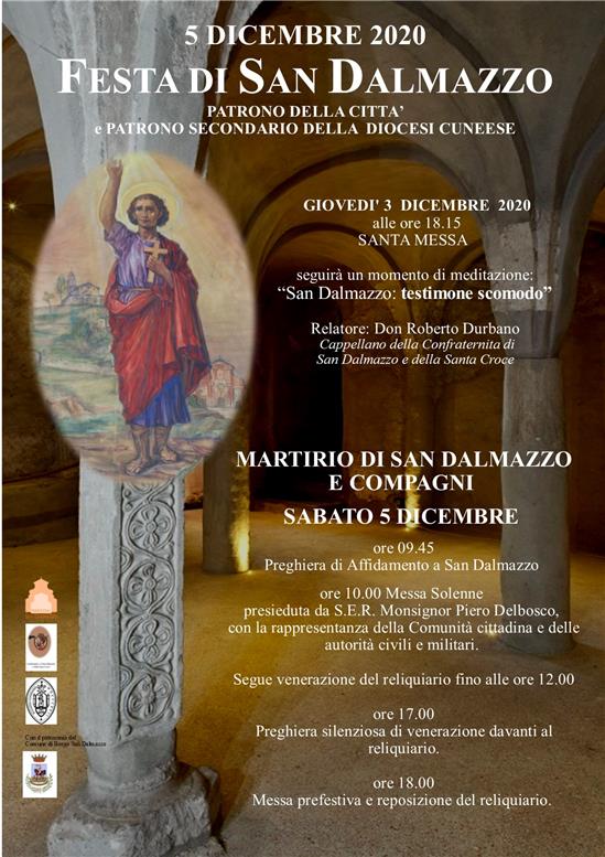 - nella giornata di sabato 5 dicembre alle ore 9.45 Preghiera di Affidamento a San Dalmazzo, seguirà alle 10.00 la Solenne Messa presieduta dal vescovo Mons. Delbosco e si concluderà con la Venerazione della reliquia fino a mezzogiorno.