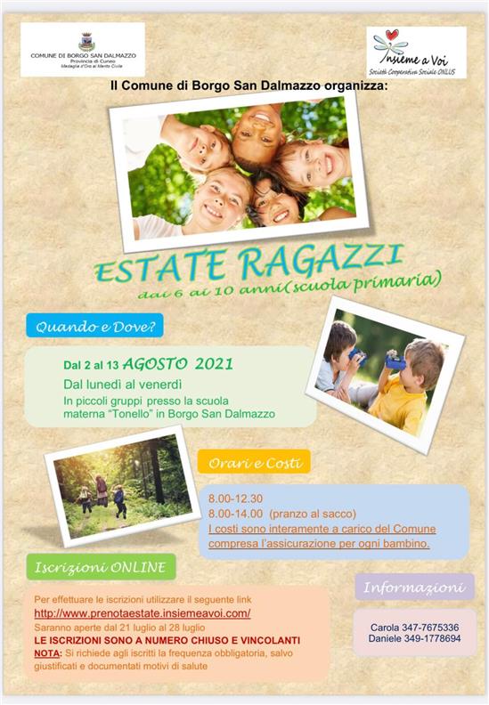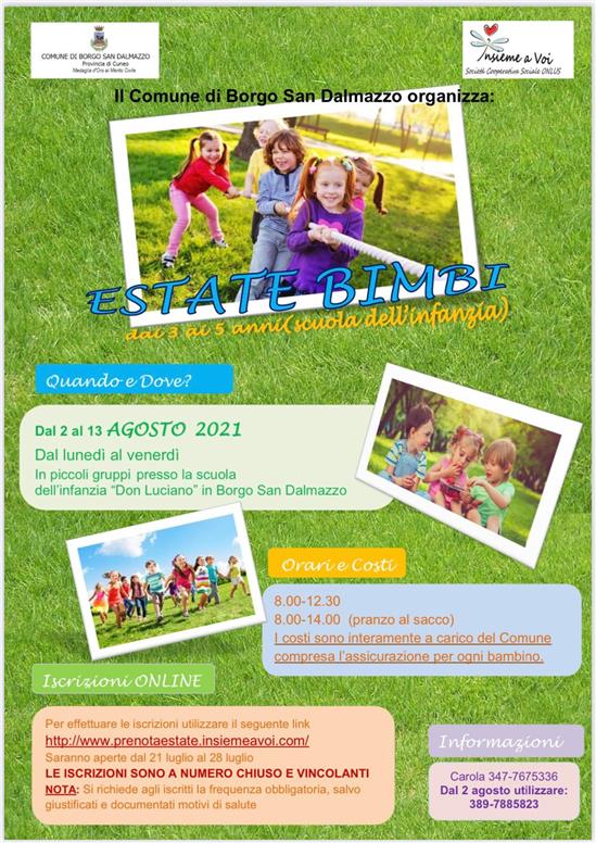Il Comune di Borgo San Dalmazzo organizza un centro estivo gratuito nelle prime due settimane di agosto. L'iscrizione è a numero chiuso e riservata ai soli residenti. Si richiede la frequenza obbligatoria per gli iscritti, salvo documentati motivi di salute.