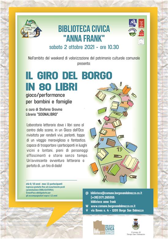 Sabato 2 ottobre alle ore 10.30 la Biblioteca Civica "Anna Frank", nell'ambito del weekend di valorizzazione del patrimonio culturale comunale, presenta: “Il giro del Borgo in 80 libri” gioco/performance per bambini e famiglie a cura di Stefania Gravina della Libreria Sognalibro. Nel corso di questo divertente laboratorio letterario i libri sono al centro della scena, in un Gioco dell'Oca rivisitato per renderli vivi, parlanti, tappe di un viaggio meraviglioso e fantastico, capace di trasportare i partecipanti in luoghi vicini e lontani, pieni di personaggi affascinanti e storie senza tempo. Un'avvincente avventura letteraria a portata di...un tiro di dado!