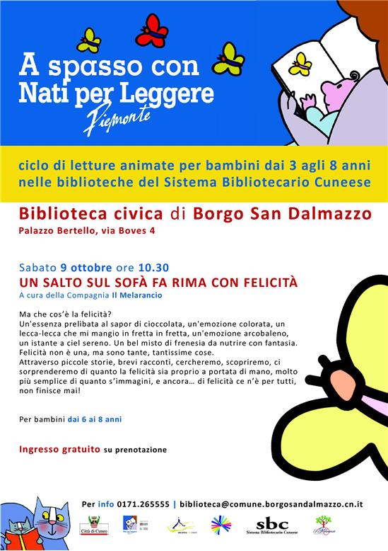 La Biblioteca Civica ospiterà sabato 9 ottobre alle ore 10.30 una lettura per bambini dai 6 agli 8 anni intitolata “UN SALTO SUL SOFÀ FA RIMA CON FELICITÀ”, a cura della Compagnia Il Melarancio e proposta nell'ambito dell'iniziativa “A spasso con Nati per Leggere Piemonte”.