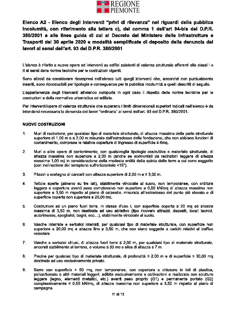 Il servizio richiama in particolare l'attenzione sul novellato: Elenco A2 - Elenco degli interventi “privi di rilevanza” nei riguardi della pubblica incolumità, con riferimento alla lettera c), del comma 1 dell’art 94-bis del D.P.R. 380/2001 e alle linee guida di cui al Decreto del Ministero delle Infrastrutture e Trasporti del 30 aprile 2020 e modalità semplificate di deposito della denuncia dei lavori ai sensi dell'art. 93 del D.P.R. 380/2001 (si allega estratto in formato .pdf dell'elenco succitato).