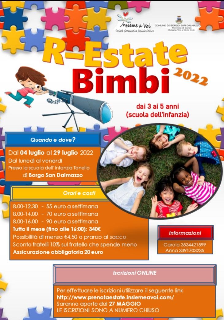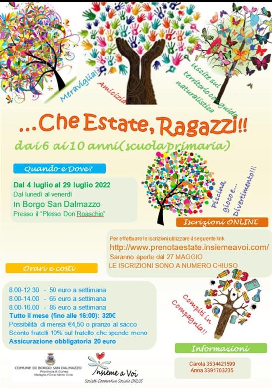 Descrizione Si segnalano le attività estive per bimbi dai 3 ai 10 anni, organizzate dalla cooperativa Insieme a Voi presso i locali delle scuole di Borgo San Dalmazzo.Iscrizioni: https://www.prenotaestate.insiemeavoi.com/Login