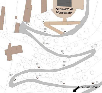 Gli attuali piloni, restaurati nel 2007, sostituirono intorno alla fine dell’ottocento le originarie edicole in legno risalenti alla prima metà del XVII secolo, epoca di costruzione del Santuario di Monserrato, ed assunsero l’aspetto attuale tra il 1939 ed il 1940 ad opera dello scultore marmista Pizzato di Torino e dello scultore Baudino di Cuneo.